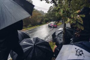 4 – Umbrellas up, rain pouring down, and Sam Touzel sliding out of the hairpin. In rally, the conditions challenge drivers and spectators alike. Everyone enduring it for the love of the sport, including myself! Alex Stefan